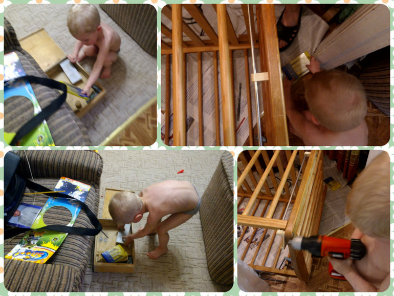 В этом посте решила собрать наши домашние дела. Дима, как настоящий мужчина обожает инструменты и все норовит чего-то починить. Папа идет ему навстречу и разрешает помогать! Тут они чинят Димкину кроватку. Малыш прыгал на ней как-то, когда никак не хотел засыпать и не выдержала кроватка лихої долі... Вот они и чинили. В ход шли дрель, сверла - вобще красота, их можно перебирать ))) ну и наш любимый шуруповерт. Он у нас под шкафом лежит и Дима периодически его достает и начинает прикручивать все, что плохо прикручено!