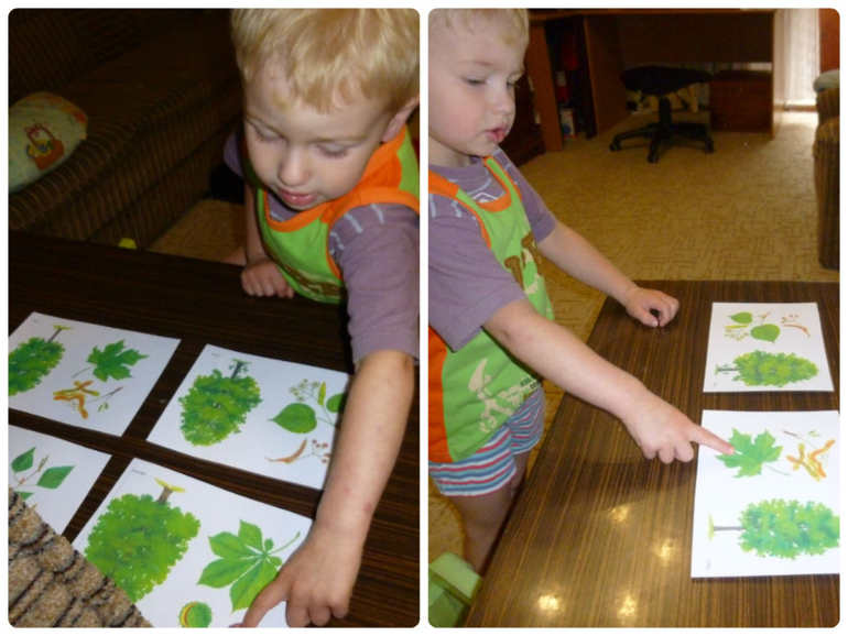 Соединили листья и плоды с одного дерева.Искали чего не хватает деткам, чтоб собрать гербарий по образцу (туго пошло).Пазл дерево. Летали по листикам липы от 1 до 5 (типа пчелка собирала липовый мед).Раскрасили кленовый лист, собрал теневое лото, потом дул на листики и они разлетались (это конечно больше понравилось, чем собирать).Эта игра (из журнала Мамине сонечко) понравилась больше всего. Вставлял стволы в прорези, приклеивал корни( заодно и повторили)и дерево то росло, то опять становилось маленьким. Такие фокусы всегда интересны, а не задания на бумажках.