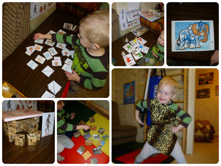Это мы австралопитеки лазим по деревьям за фруктами.Чуть дальше по лестнице эволюции - разделение труда. Копья мужчинам, корзинки - женщинам.Мужчины вернулись с охоты и стали разбирать где чьи шкуры.Человек умелый - это вам уже не просто так - построили пещеру. рассмотрели орудия труда и развитие быта.Как научились древние люди шить - начали делать первую одежду. Наш человек умелый ровно две минуты попозировал в шкуре и сказал "Хватит!".Мамонту тоже не повезло. Сначала где-то шерсть пропала, ну а потом мы его помоги и стал он выглядеть тоже не особо:облезший синий зверь... Ну зато смысл понятен - холодно, надо утепляться!Ну а тут как все. На охоту сходили. Огонь разожгли. И палочкой, и камнями.Дичь приготовили, дрова исправно подбрасывал.Посчитали пойманную дичь, собрали хворост для костра разных пещерных семеек. Потом у нас был еще вечер при свечах, разговор об огне и бесконечное задувание свечей.Я кое-что еще планировала, но не вышло. Но в любом случае на мое удивление и вопреки сомнениям понятия про древних людей достаточно хорошо отложились в Димкиной голове. Австралопитек вообще стал достоянием нашего лексикона. Он мне как-то говорит: "Мама, не надо на меня сердиться. Если люди будут сердиться, то ничегоне будет. Ни города, ни дома, ни игрушек. И мы будем жить как австралопитеки на дереве". Во как!Все идеи и исполнения взяты у девочек! Огромное им спасибо!Светлана, , Люда, Мария (хоть и наша копия материала не открылась, но может вам пригодится! А ей огромное спасибо все равно!) и многие другие.Всем спасибо и удачи!