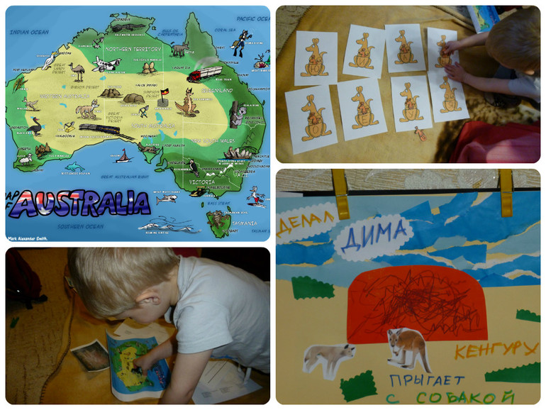 Началась наша игра совсем не с Австралии, а с того, что мы пошли на пляж, а там, на море приплыл к Диме осьминог (ну это все ребенкины вымыслы). Сначала они (Дима и мама осьминог) плавали и баловались в море. И осьминог решил пригласить Диму к себе домой в гости (ходить по гостям - это наше все!). Живет осьминог, как оказалось, в Австралии (такая вот нелегкая у него судьба, что тут поделаешь).