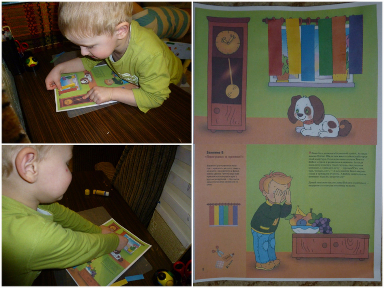 Начали занятие с рассказа про маленького щенка, который любил играть в прятки. А вот теперь он не знает, где спрятаться. Надо сделать занавесочку на окне (по образцу). Приклеили. Понарошку поиграли в прятки (прикрывала ладошкой, а Д. как-будто искал).